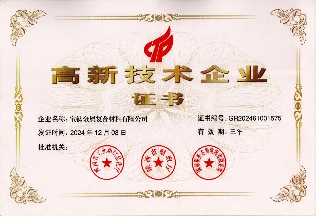 近日,宝钛集团复合材公司凭借卓越的创新能力和深厚的科技实力,被陕西省工业和信息化厅、陕西省财政厅和国家税务总局陕西省税务局联合认定为“高新技术企业”。
