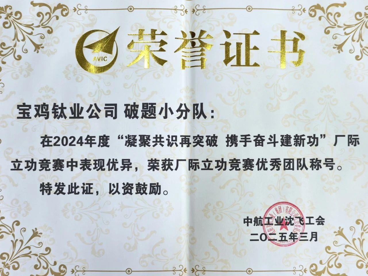 近日,在沈阳飞机工业(集团)有限公司工会揭晓的2024年度“凝聚共识再突破 携手奋斗建新功”厂际立功竞赛获奖名单中,宝钛股份以卓越表现获得多个奖项:宝钛股份荣获“表扬单位”称号,宝钛股份王勤波带领的破题小分队荣获“优秀团队”称号,宝钛股份杨军荣获“先进个人”称号。这不仅彰显了宝钛股份在航空钛材领域的全链条服务能力,更标志着宝钛股份与航空工业链主企业的战略协作迈上了新台阶。