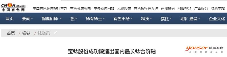 近日,宝钛股份再传喜讯,该公司突破技术及设备极限,成功用钛及钛合金材生产锻造出13米长的台阶轴,创造了国内钛材加工制造台阶轴长度的历史新记录。