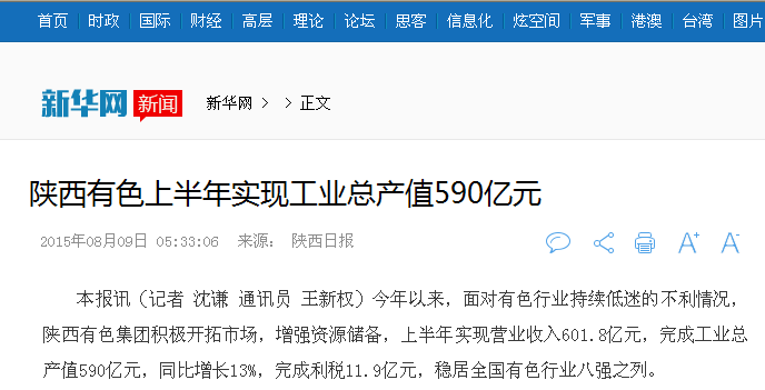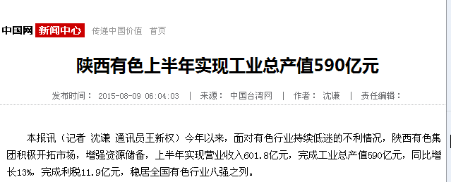 本报讯(记者 沈谦 通讯员 王新权)今年以来,面对有色行业持续低迷的不利情况,陕西有色集团积极开拓市场,增强资源储备,上半年实现营业收入601.8亿元,完成工业总产值590亿元,同比增长13%,完成利税11.9亿元,稳居全国有色行业八强之列。
