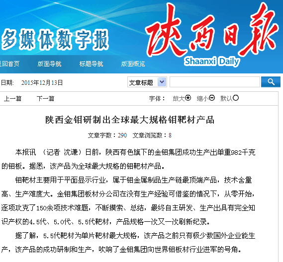 陕西日报:陕西金钼研制出全球最大规格钼靶材产品-尊龙凯时国际娱乐