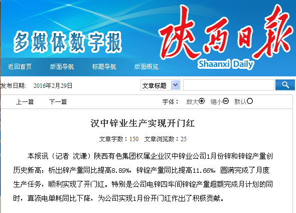 陕西日报:汉中锌业生产实现开门红-尊龙凯时国际娱乐