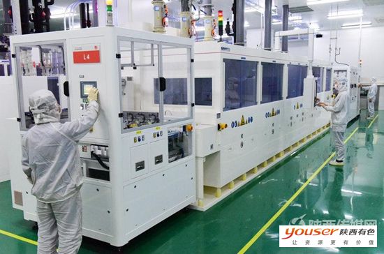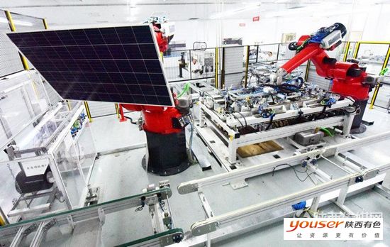 11月16日,在陕西有色光电科技公司光伏电池组件生产线上,员工正在借助引进德国的徕斯六轴机器人进行作业。该公司1gwp太阳能光伏电池项目一期今年初陆续试车试产,面对不利的宏观经济环境和复杂多变的光伏市场形势,公司克难奋进,爬坡过坎,实施创新驱动战略,实现了试产运营的良好开局,2016年有望完成销售收入25亿元。