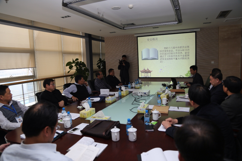 公司总经理张继祥在会议最后讲话。他说,党的十八届四中全会《决定》提出了全面推进依法治国的一系列新观点、新举措,是加快建设社会主义法治国家的纲领性文件和行动指南。公司班子成员都要认真学习,深刻领会,自觉落实。法律相关部门要深入研读,尽快梳理与企业相关的内容,提出实施意见。中心组学习要进一步引向深入,进行有针对性地解读辅导,使企业经营管理在法治的规范和引领下,不断向新的水准迈进。