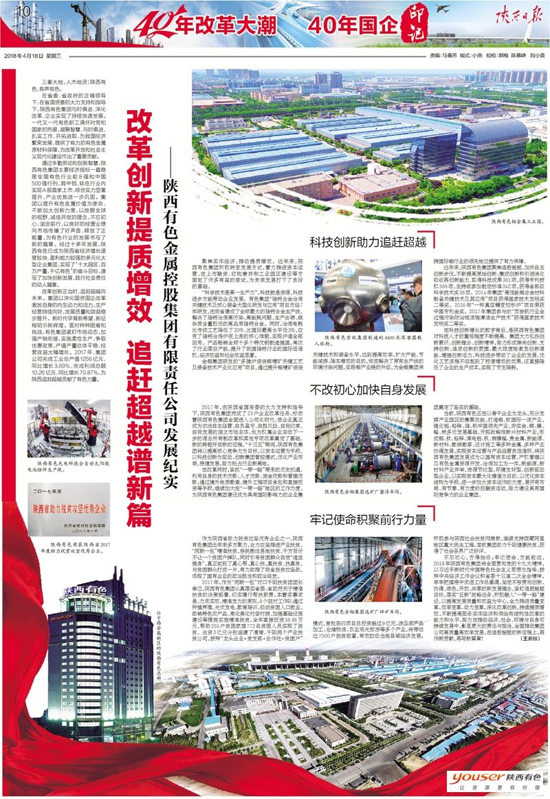 2017年,在陕西省国资委的大力支持和指导下,陕西有色集团完成了23户企业改革任务,标志着陕西有色集团全面进入公司化时代,使企业真正成为依法自主经营、自负盈亏、自担风险、自我约束、自我发展的独立市场主体,也为权属企业启动下一步的混合所有制改革和其它专项改革奠定了基础。新的跨越开启新的征程。“十三五”期间,陕西有色集团将以提高核心竞争力为目标,以资本运营为手段,以科技创新为驱动,创新集团管控模式,优化产业布局,稳健发展,努力抢占行业新高地。