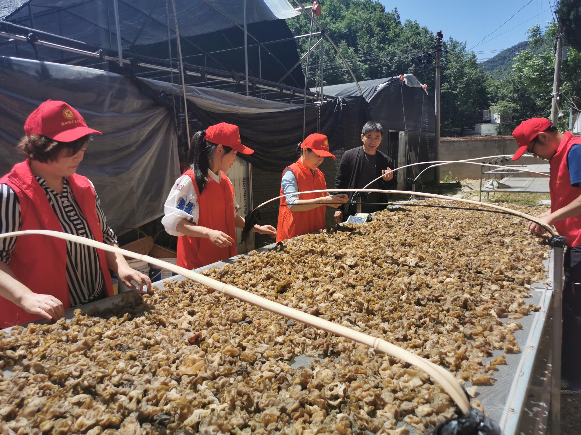 此时正值木耳采摘期,志愿者首先来到当地贫困户邹胜全承包的木耳种植大棚内,与她畅谈木耳的种植、栽培和采摘流程,帮助她采摘、晾晒新鲜木耳200余斤;随后,志愿者进入马尔峡河道,沿河道行走3公里,捡拾饮料瓶、塑料袋、废弃物等生活垃圾60余斤,并对公司厂区外道路两侧杂草进行了清理。